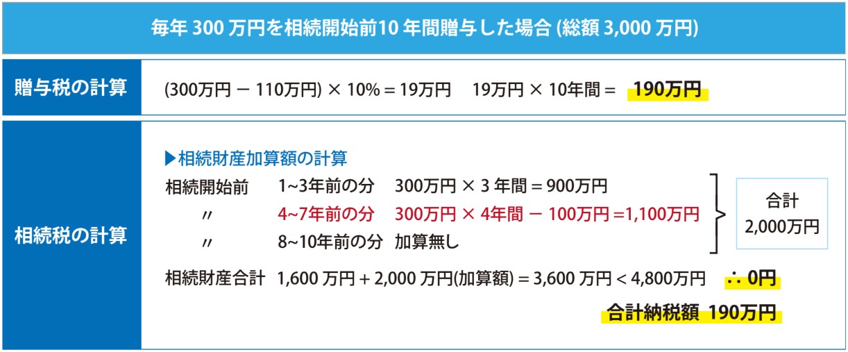 | 計算例 | 贈与財産 3,000万円、相続財産 1,600万円の場合 (法定相続人 : 配偶者 1 人、子 2 人) |